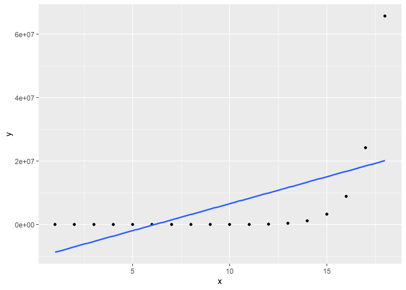 Pearson correlation indicates a moderately positive linear relationship between our sample data. We know that this isn’t true, since we plotted an exponential curve. However, we do know that the variables move in the same direction.