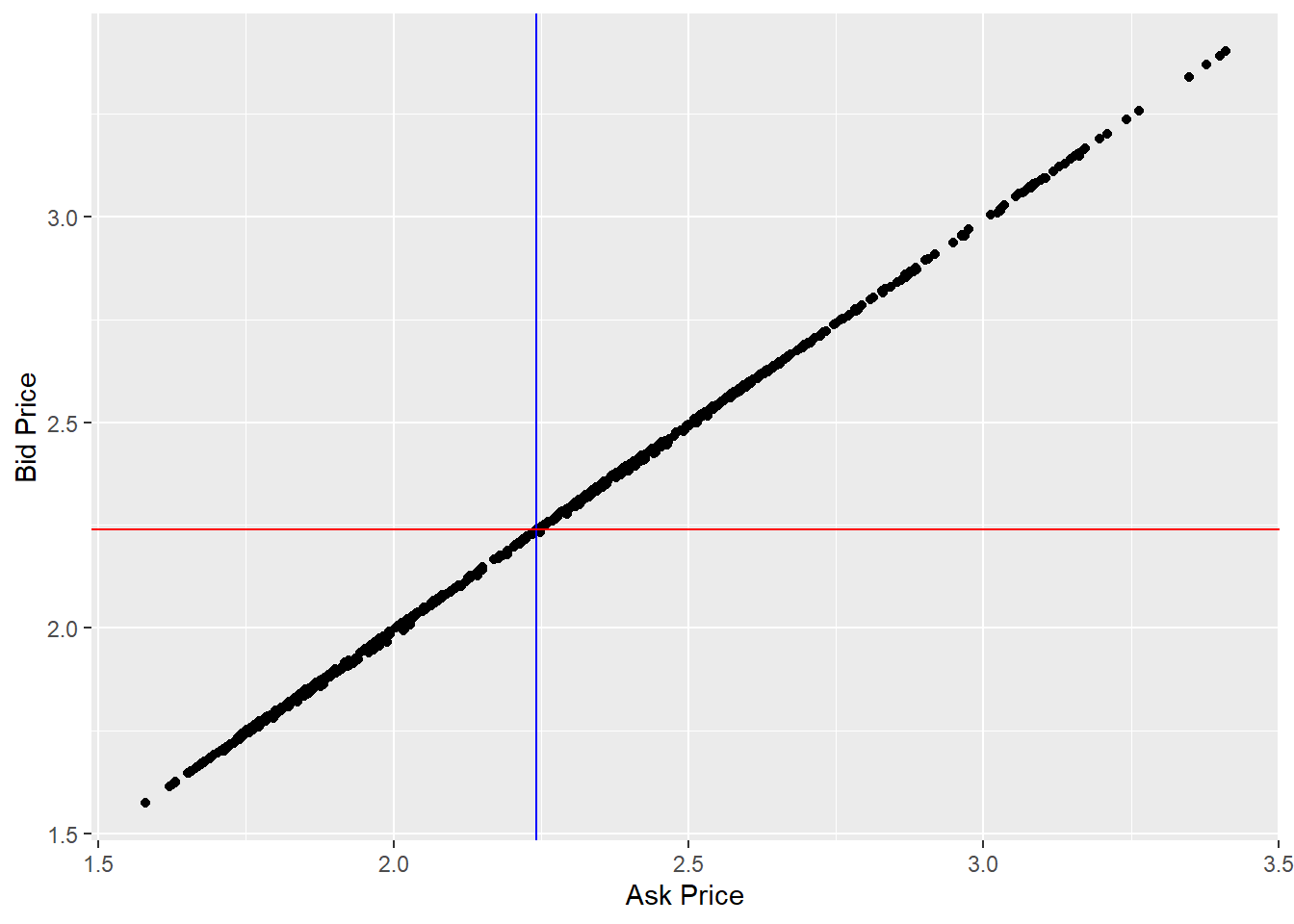 The relationship between Bid Price and Ask Price has a positive covariance. \(E[X]\) is the blue vertical line and \(E[Y]\) is the red horizontal line. When \(X\) (Ask price) is less than \(E[X]\) (mean of Ask price), or left of the blue line, \(Y\) (Bid price) is also less than \(E[Y]\) (Mean of bid price). Thus, \(X - E[X]\) and \(Y-E[Y]\) are both negative when \(X\) and \(Y\) are less than their means. The product of the two negative differences is positive. \(X - E[X]\) and \(Y - E[Y]\) are both positive when \(X\) and \(Y\) are greater than their means. The product of these differences are also positive. For a proportional relationship, the average of the variable’s differences, or the Covariance, is always positive.
